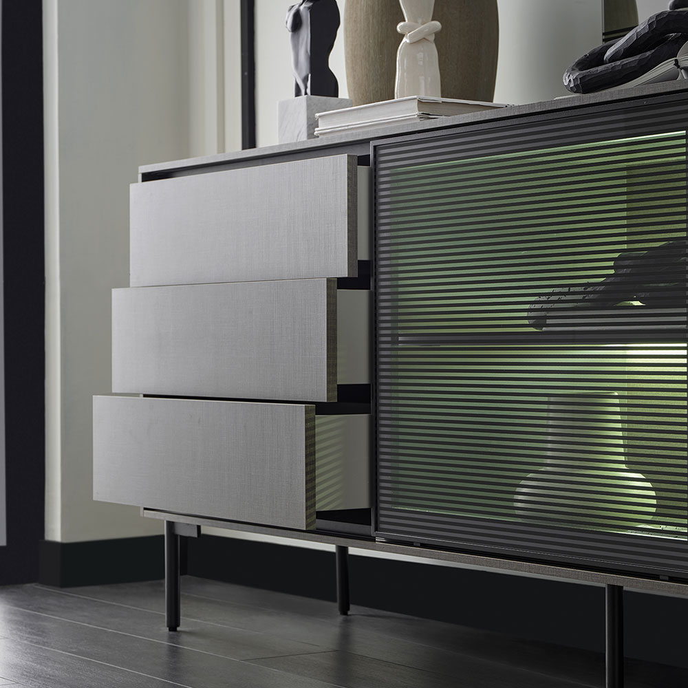 BERTA CONSOLE, which presents a modern and sophisticated style with its qualified design details, makes a difference with its functional features such as push-to-open and sliding door mechanism as well as LED lighting application. It creates a stylish decorative effect thanks to its textile texture coating enriched with metal effects special to Enza. In addition to its glass and wooden door sections, it provides large storage areas with 3 drawer applications, while adding a contemporary touch to living spaces.