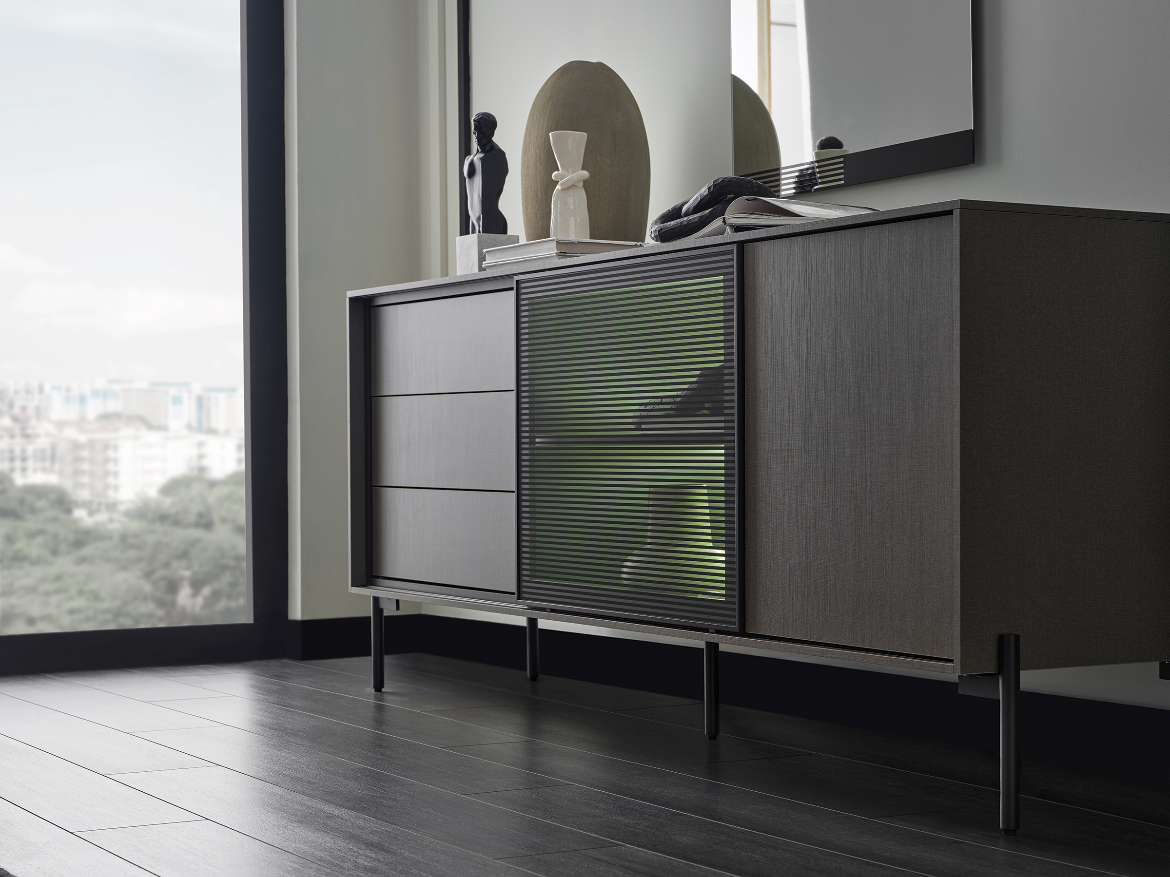 Combining aesthetics and functionality with elegant design details, BERTA CONSOLE adds a unique aesthetic touch to the decoration with its textile textured surface application special for Enza Home, while creating a contemporary decoration enriched in details with its special metal leg design compatible with the series.
