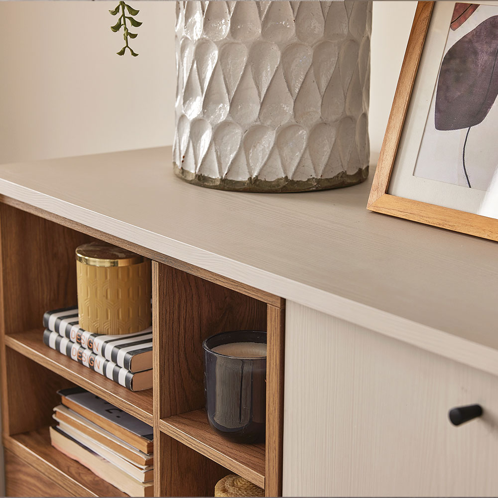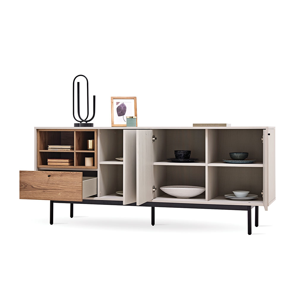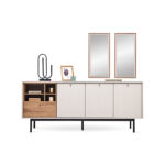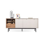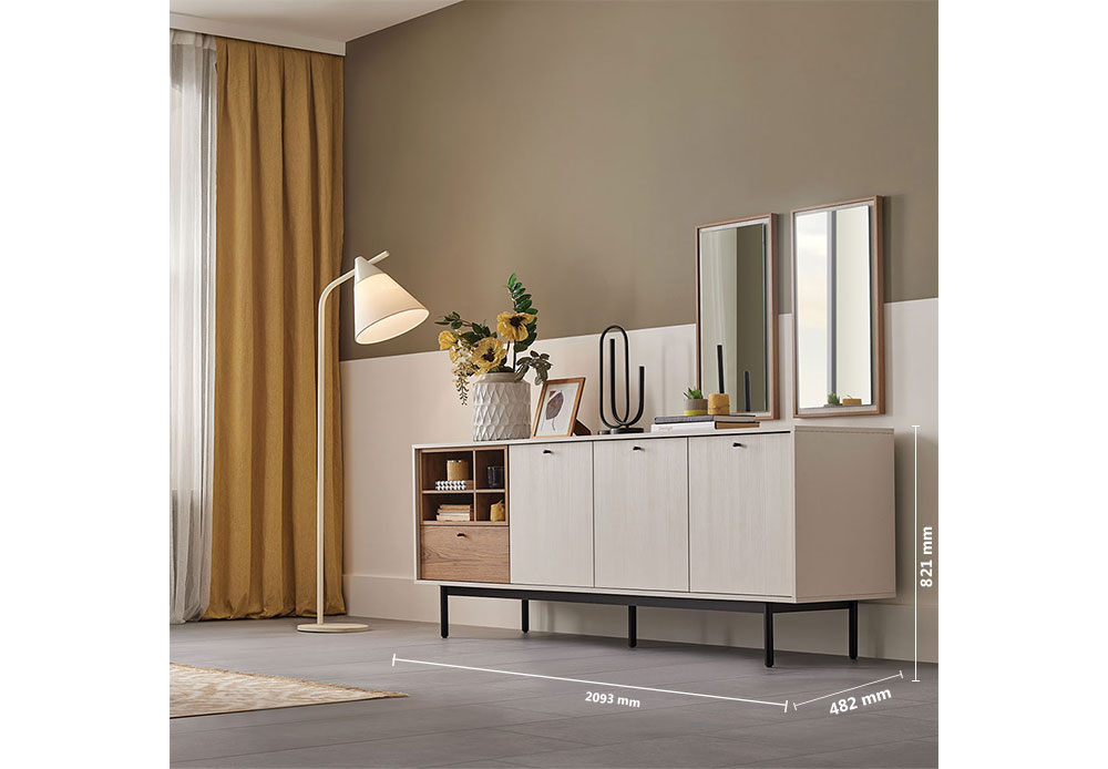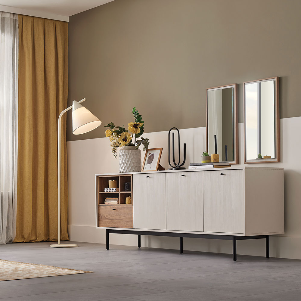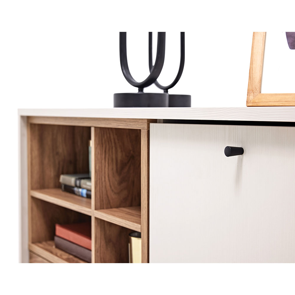 LORETO CONSOLE brings together living spaces with a modern industrial style with its dynamic design where naturalness stands out. Completing the off-white and light walnut color combination with metal matte black handles, LORETO CONSOLE achieves a warm appearance that is compatible with spaces.