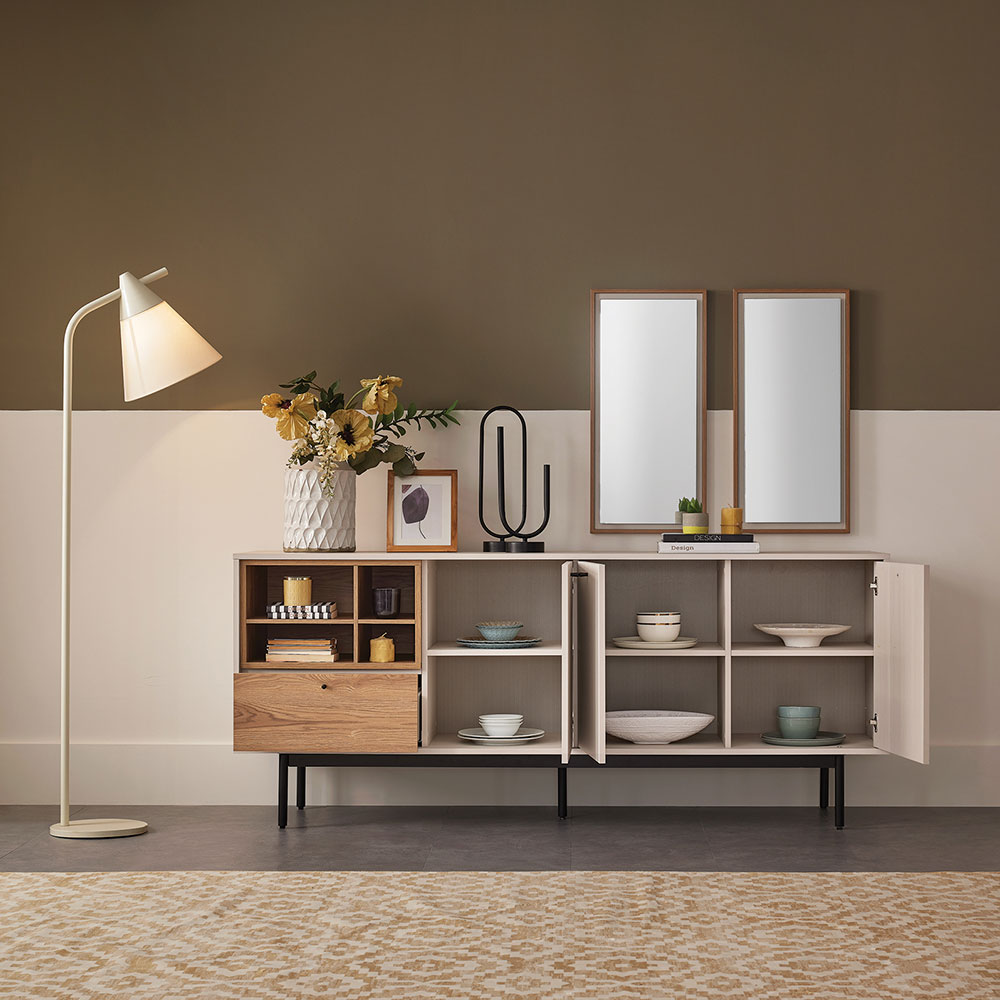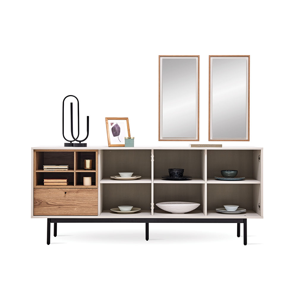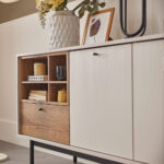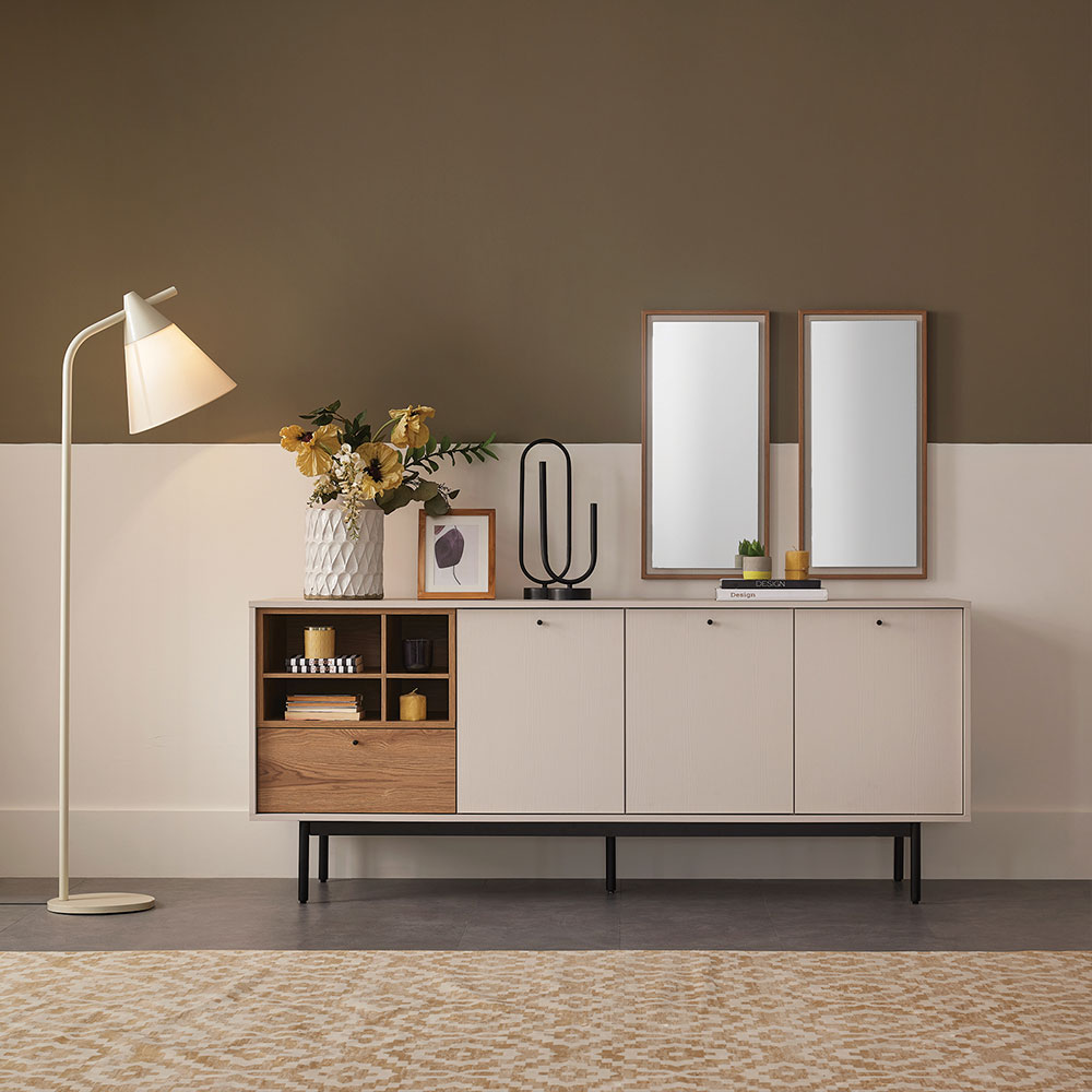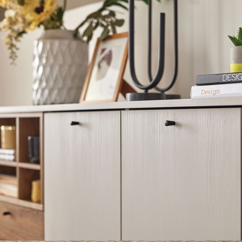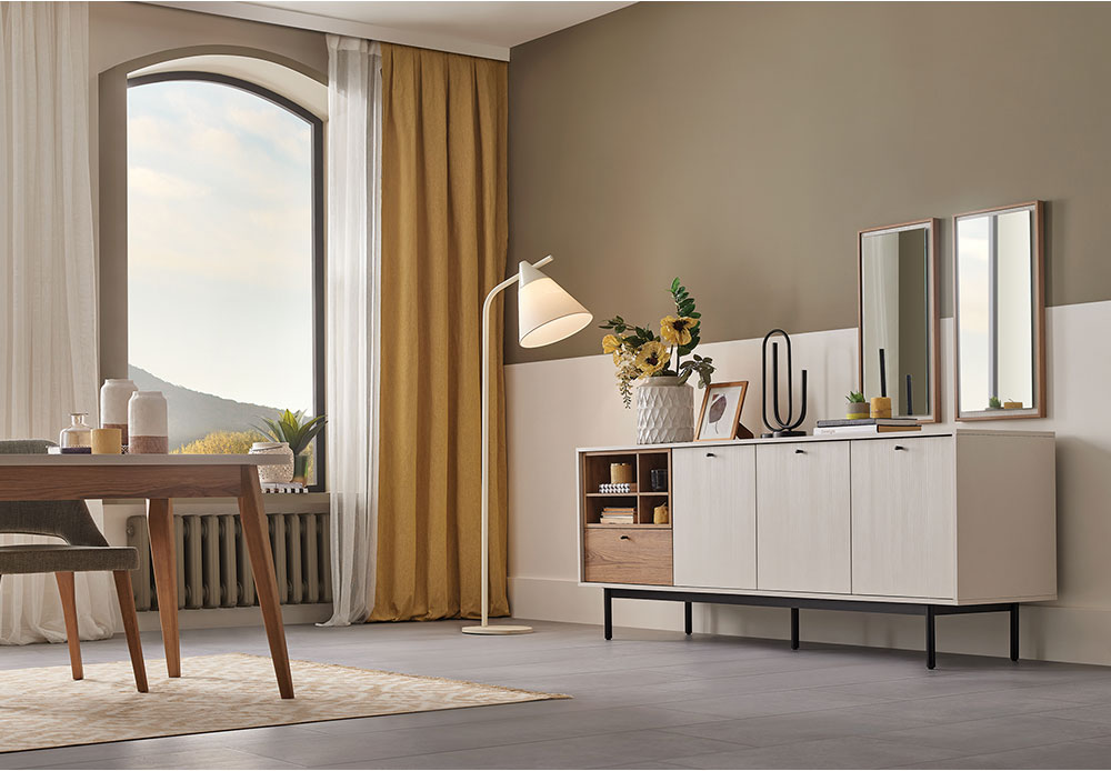 LORETO CONSOLE brings together living spaces with a modern industrial style with its dynamic design where naturalness stands out. Completing the off-white and light walnut color combination with metal matte black handles, LORETO CONSOLE achieves a warm appearance that is compatible with spaces.