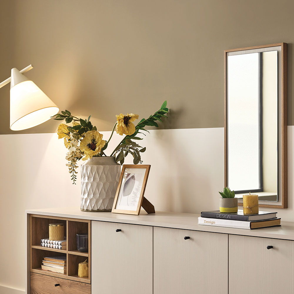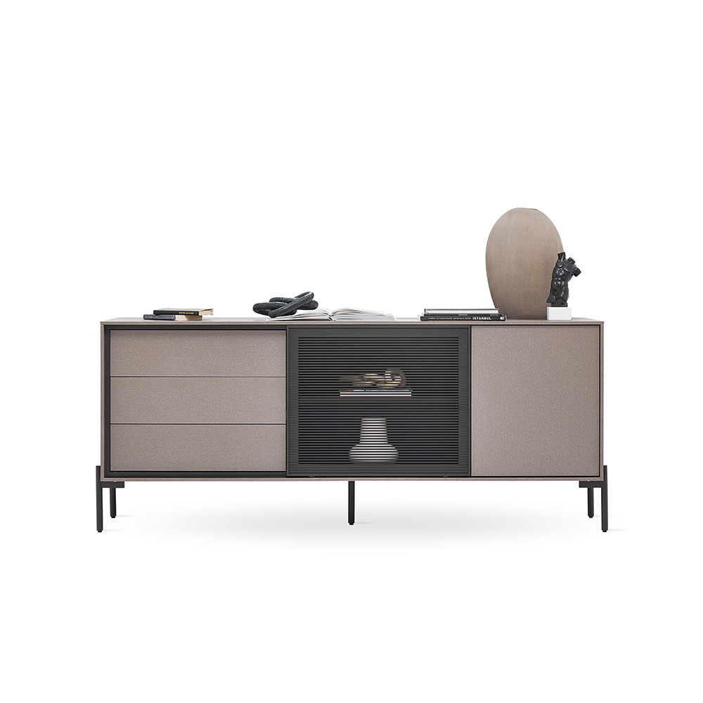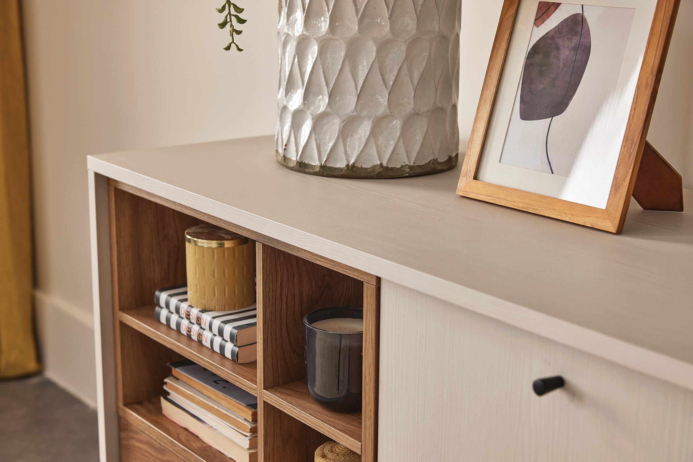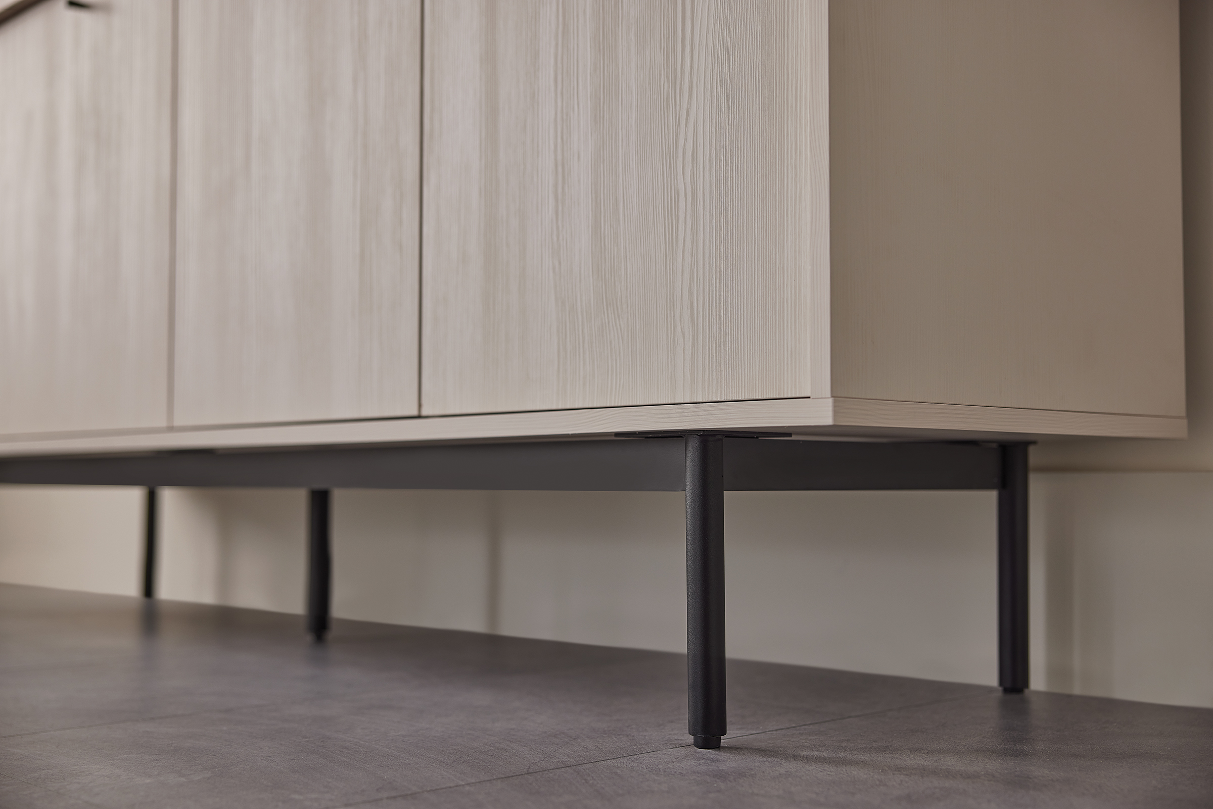 LORETO CONSOLE brings together living spaces with a modern industrial style with its dynamic design where naturalness stands out. Completing the off-white and light walnut color combination with metal matte black handles, LORETO CONSOLE achieves a warm appearance that is compatible with spaces.