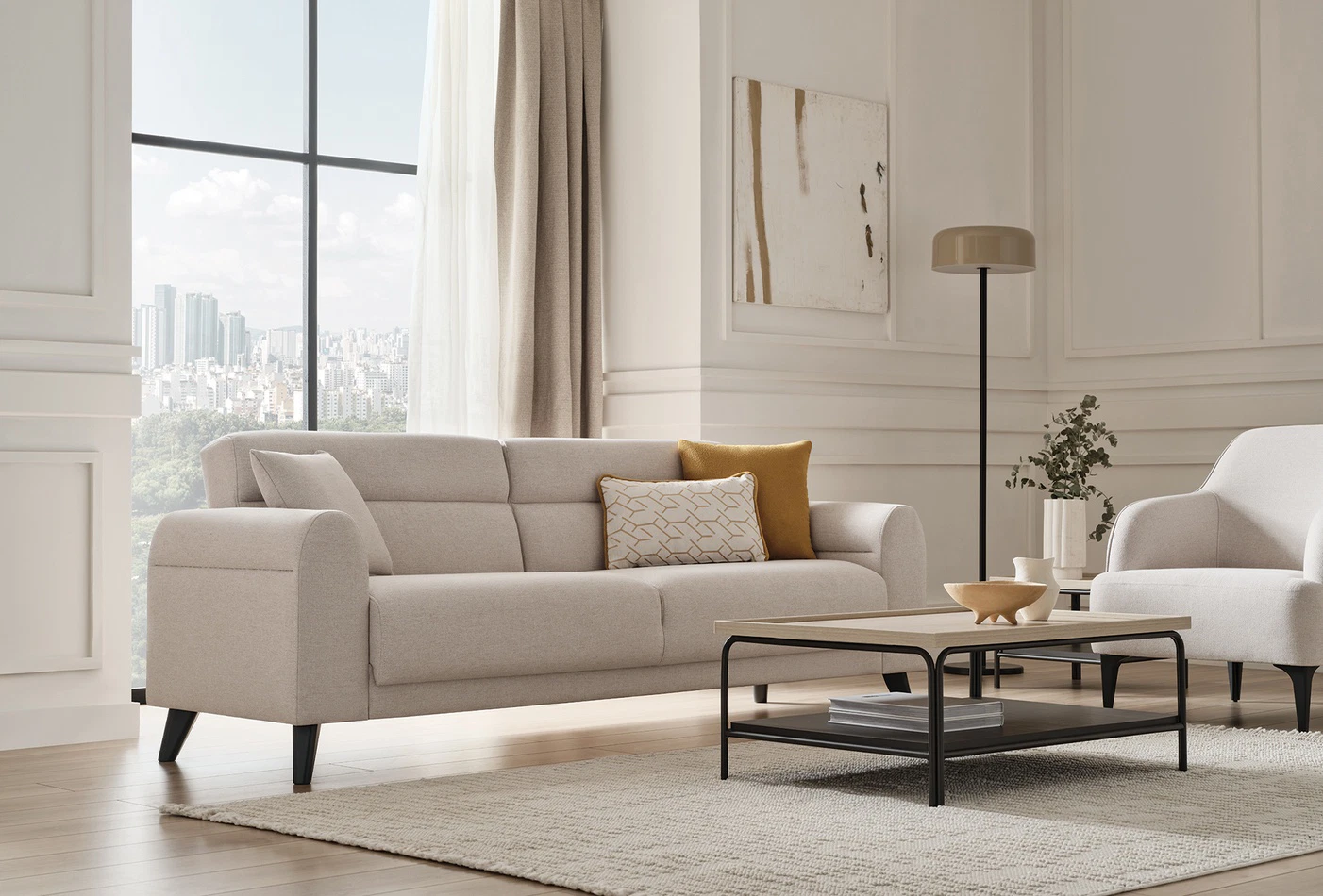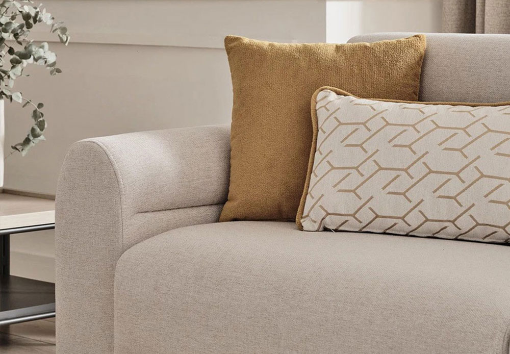 Standing out with its modern and stylish design, PALOMA SOFA SET brings a new interpretation to contemporary design with its simple and stylish details. Standing out with its full and soft structured wide seating area and ability to be converted into a bed, PALOMA SOFA SET draws attention with its special stitching applications used on the body and arms, rich fabric and decorative cushions.