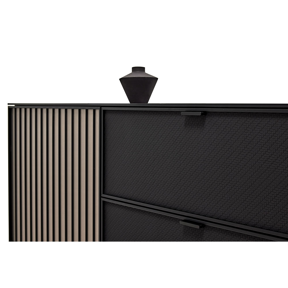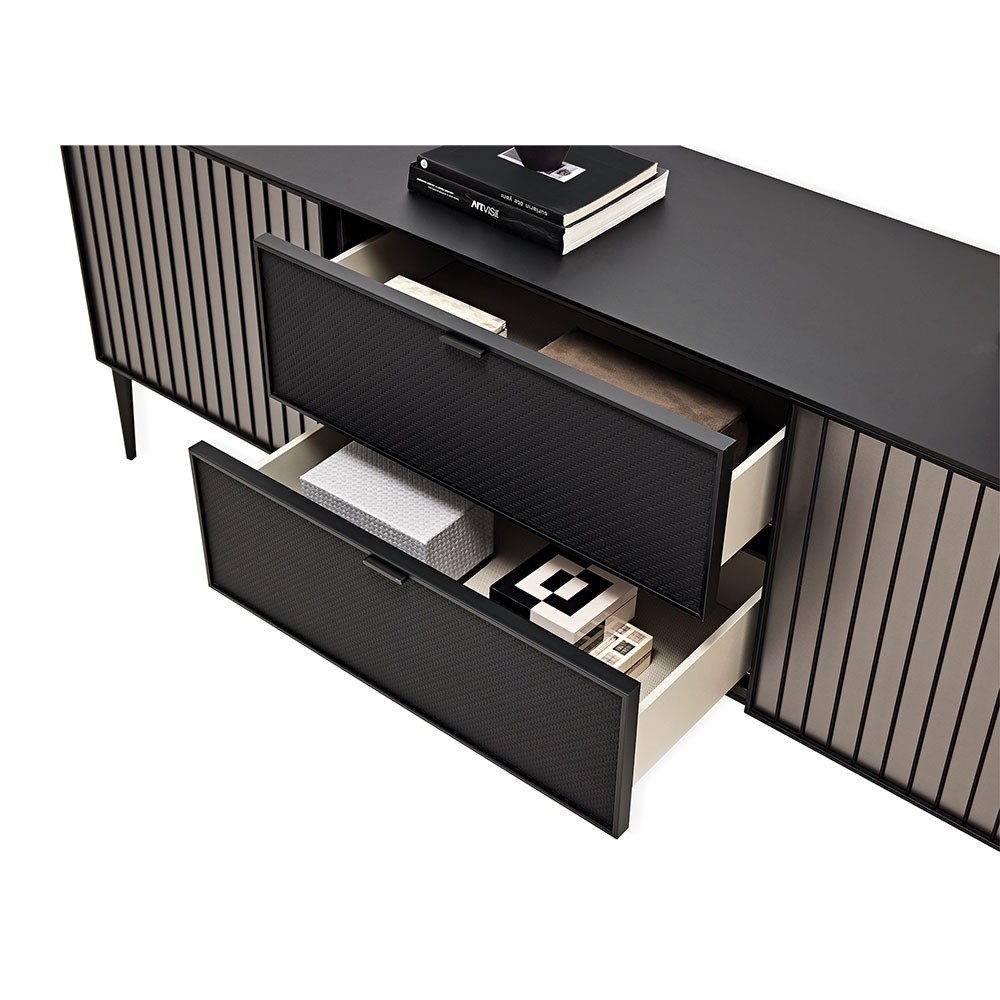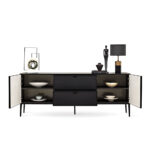 RIGA CONSOLE; It provides integrity in spaces with its black metal handle and foot design. While providing ease of use with the push-to-open mechanism and self-braking rail system on the covers, it also stands out with its functionality, allowing you to create a sophisticated and refined style.