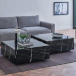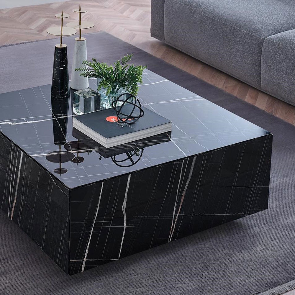 TOSCA COFFEE TABLE dazzles with its simple, modern design and noble style. Black marble pattern surfaces add a unique elegance to the decoration of living spaces. TOSCA COFFEE TABLE, thanks to its square form, makes the seating areas more useful without narrowing the spaces, and thanks to its wheeled feet, it can be easily moved and is a practical and useful option.