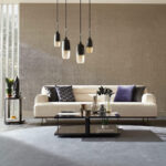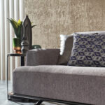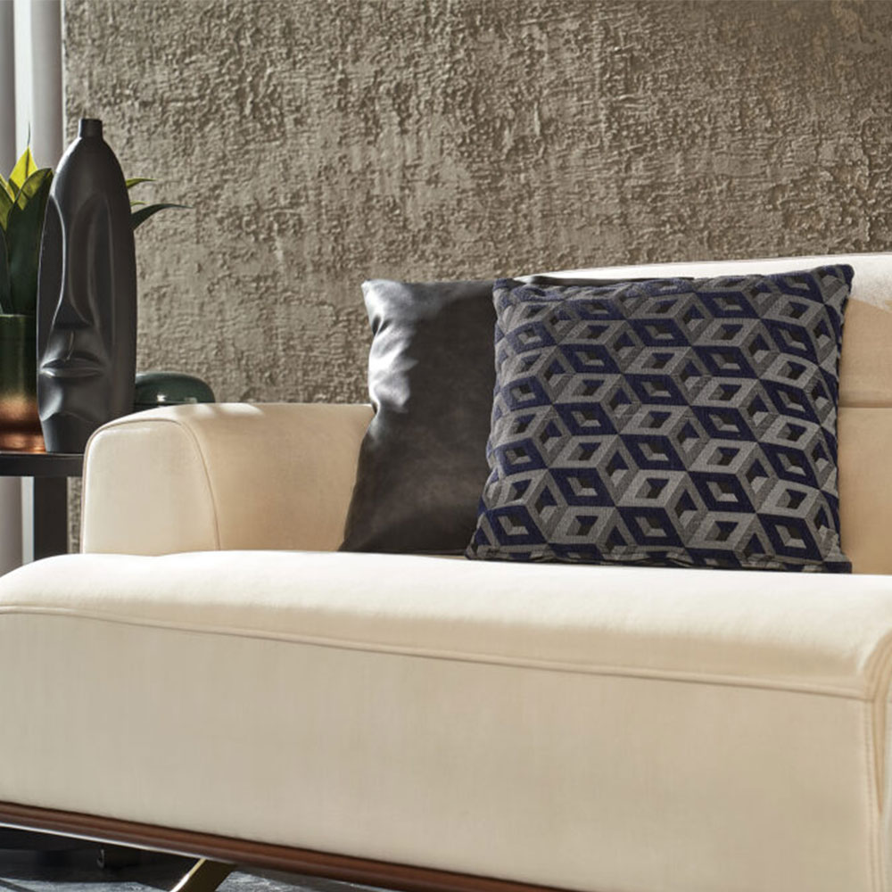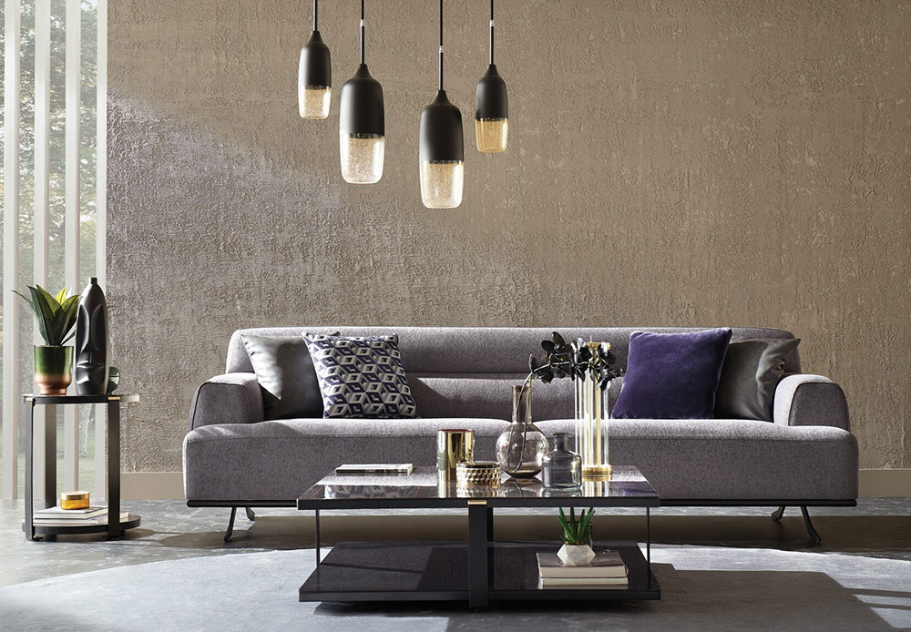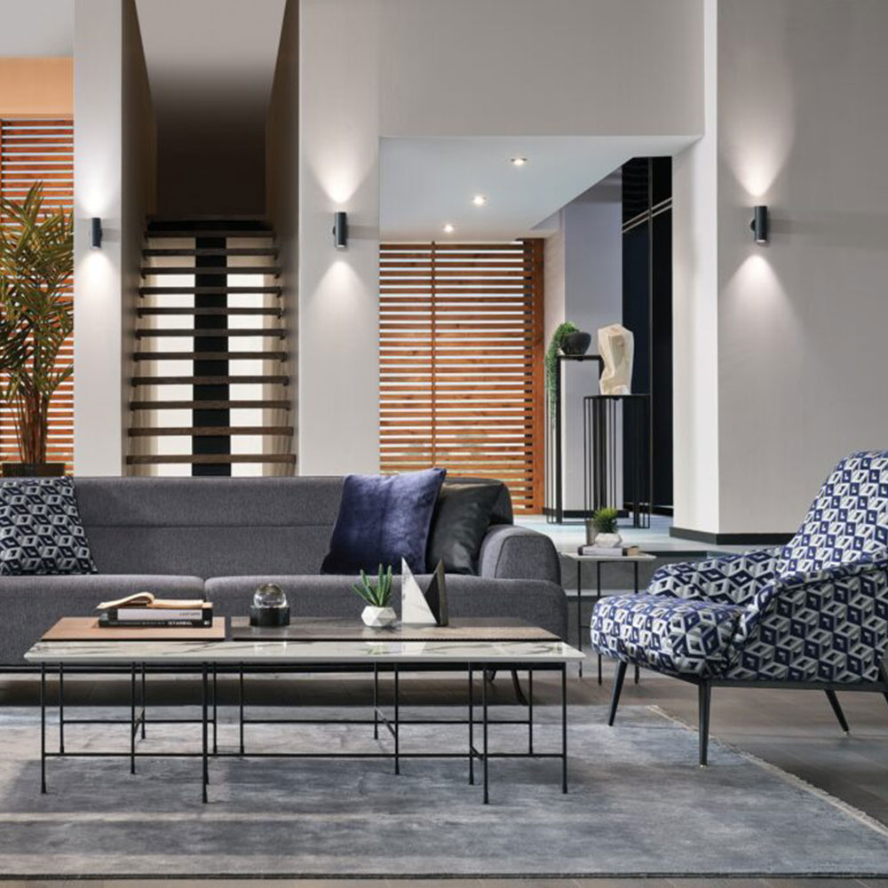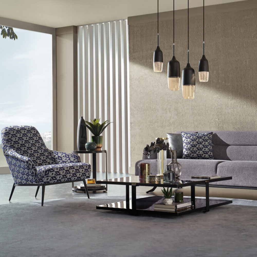 Providing maximum comfort with its multi-layer foam technology in the seating area, VALDERA LIVING ROOM creates a refined effect with its artificial suede fabric. It adds an elegant dynamism to living spaces with geometric patterned armchair and throw pillow alternatives. Representing the sustainable design approach with its metal-supported wooden construction, VALDERA LIVING ROOM enriches its design with two different colour alternatives as black base/black leg and walnut base/gold leg.